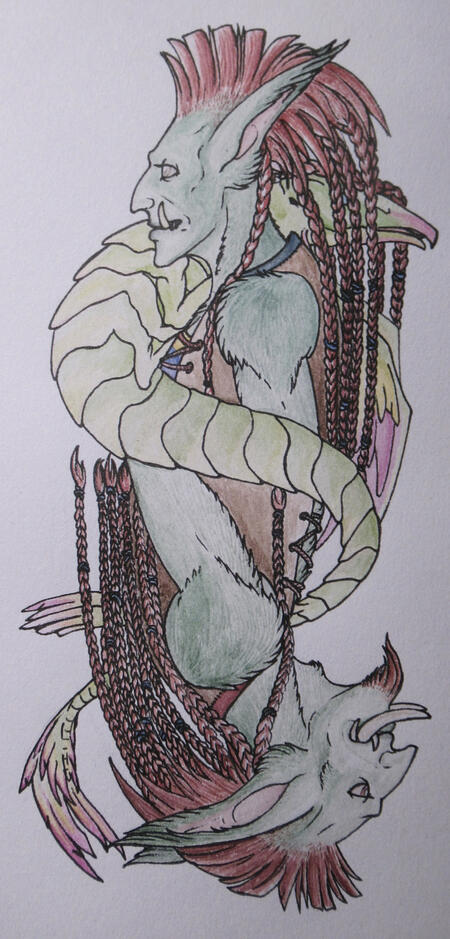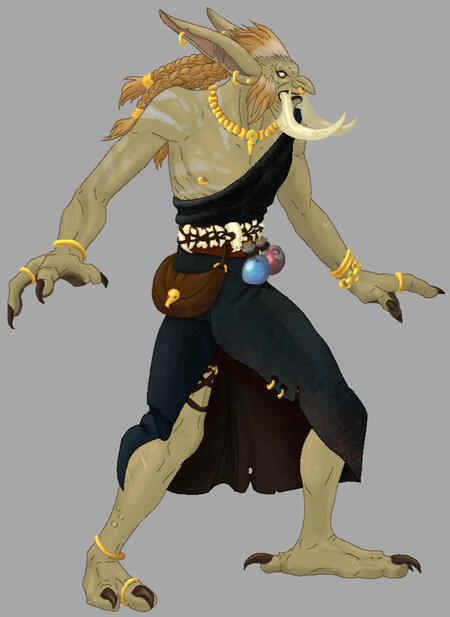 Additional info: Loves a good fight - and it can be a playfight, not just a serious, deadly one.Enjoys being around people, whether talking, fighting, just chilling or...Aside from Zandali, speaks a little bit of Orcish. Knows some Common words, suspects meaning of a few more. Not enough for a conversation. Knows some Dwarven curse words, but not their exact meanings, just what they are.He has some talent for languages, just no interest in actually learning.His favorite season is winter - his fungal infection calms down then.Surprisingly flirty. Surprisingly successful at that, too.