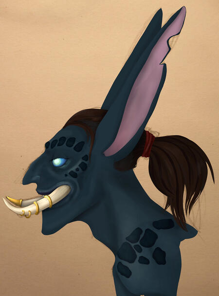Quirks: Isn't great at staying still and silent unless putting actual effort into it. He's not gonna break out into dance out of nowhere, but he'd nod to some inner beat, tap his foot on the ground, drum his fingers against a tusk... Yet when moving he is often quieter than intended. His accidental sneaking had scared more people than any of his purposeful Big Evil Troll act.